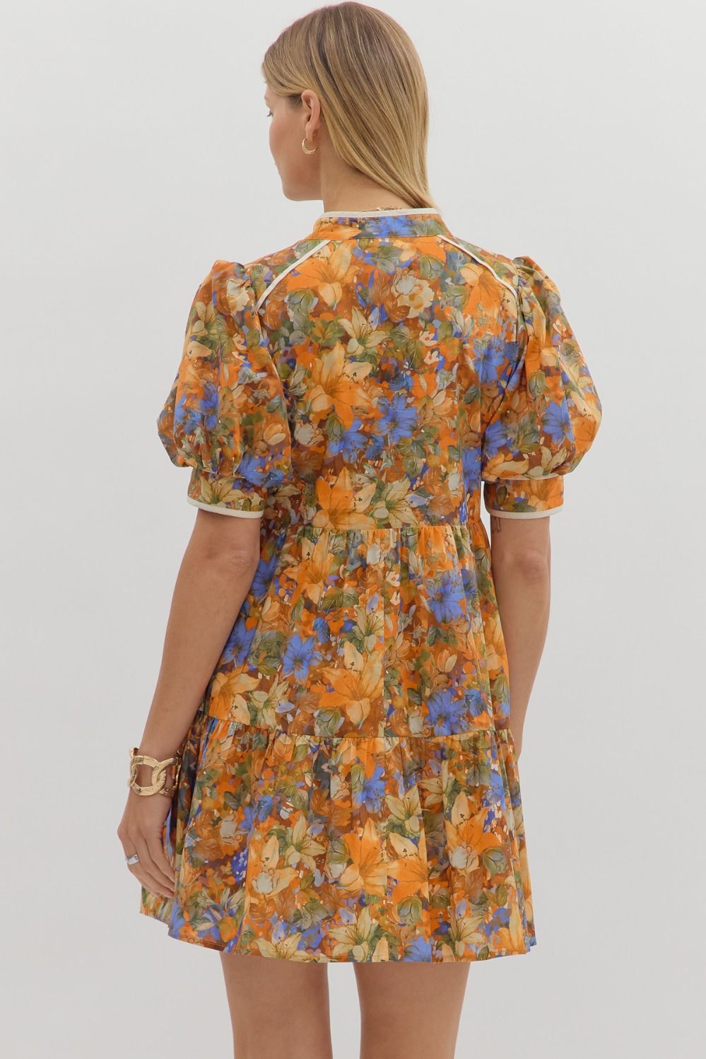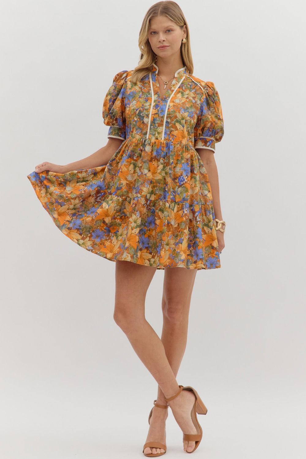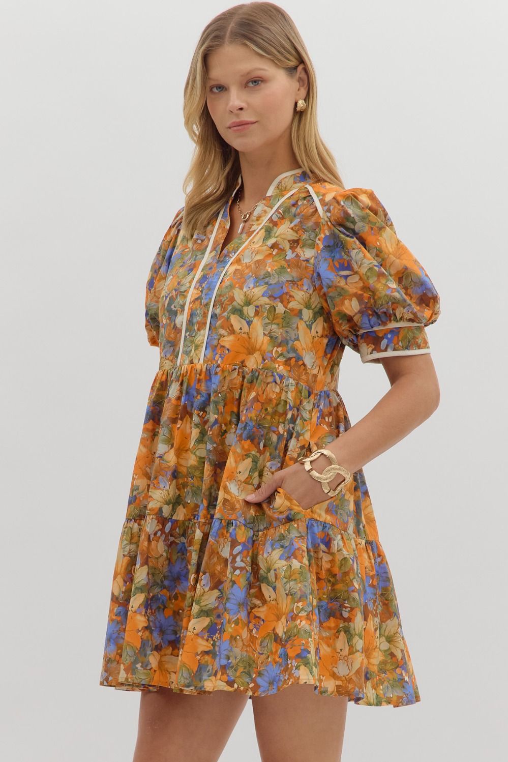 Mutli floral print, cuff band, puff short sleeve mini dress featuring contrast binding collar and band finish. Side pockets. Lined. Woven. Non-sheer. Lightweight