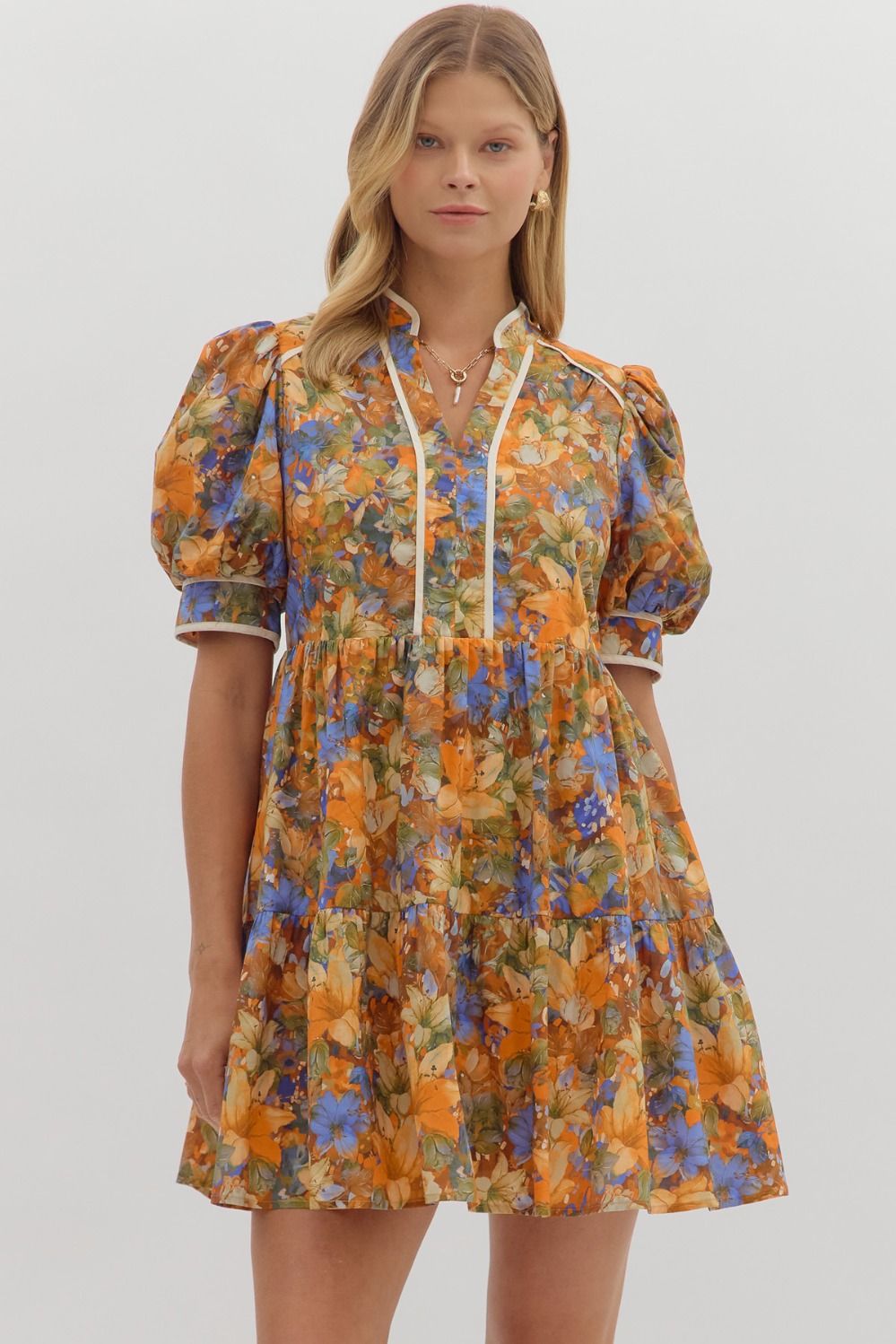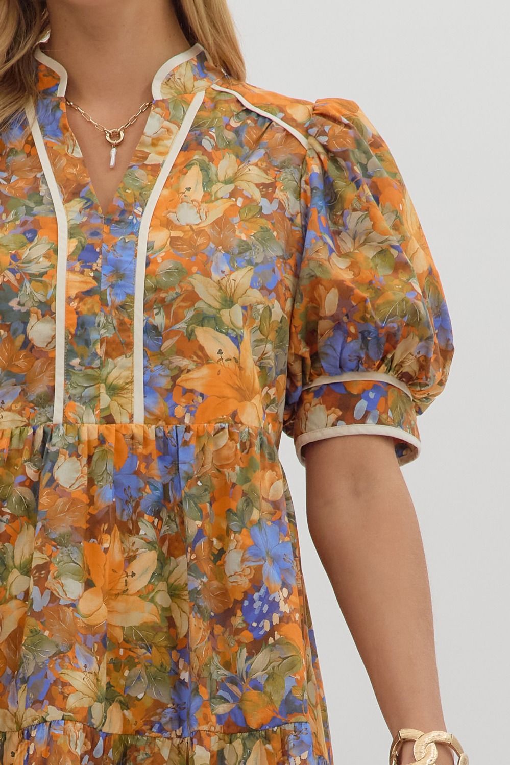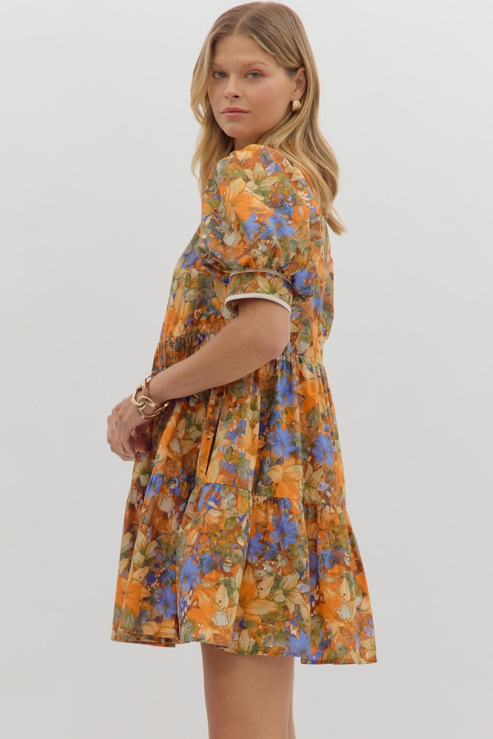 Mutli floral print, cuff band, puff short sleeve mini dress featuring contrast binding collar and band finish. Side pockets. Lined. Woven. Non-sheer. Lightweight