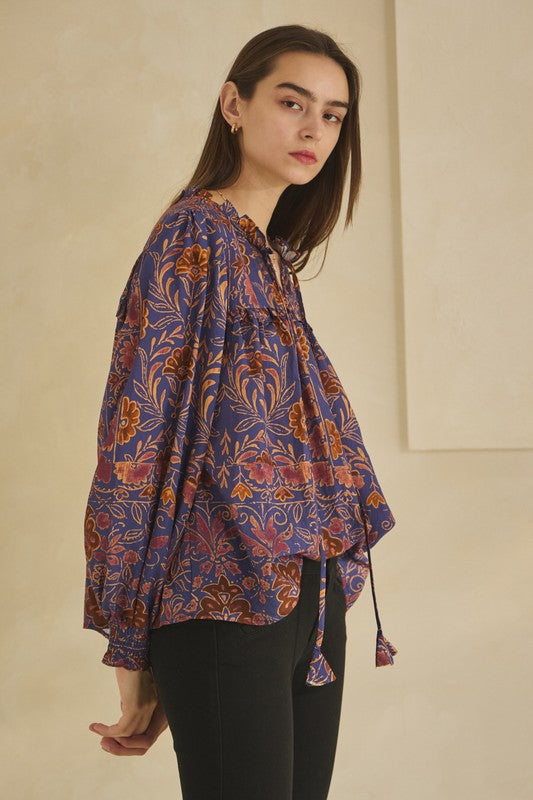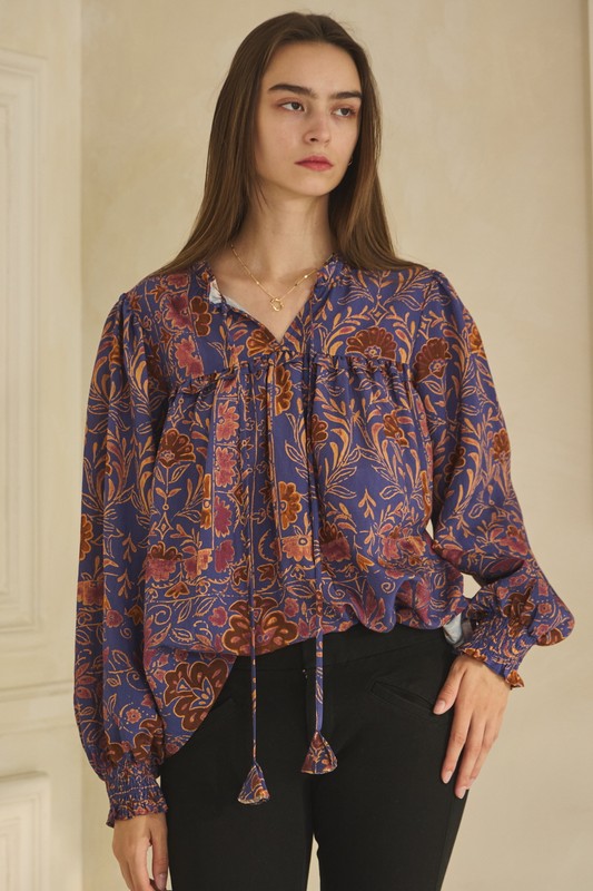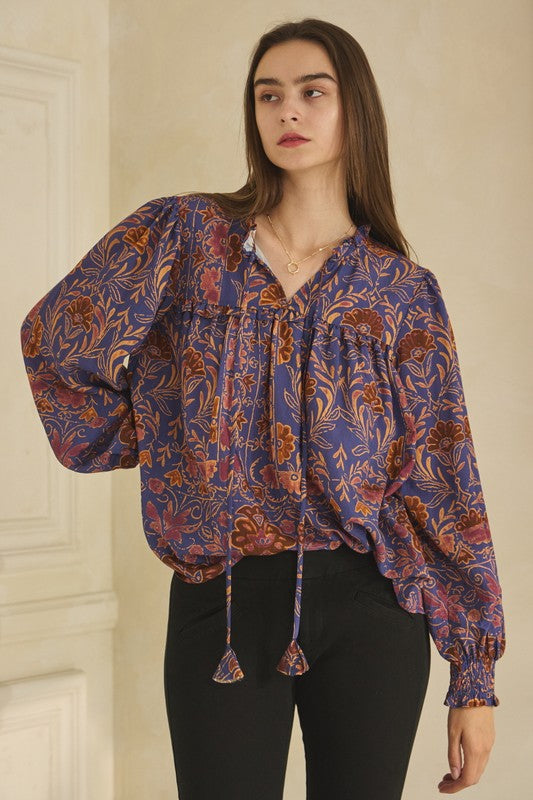 Floral printed, long sleeve blouse featuring a ruffle neck & a front tie with a ruffled yoke. Beautiful color combination and a silky, lightweight fabric.