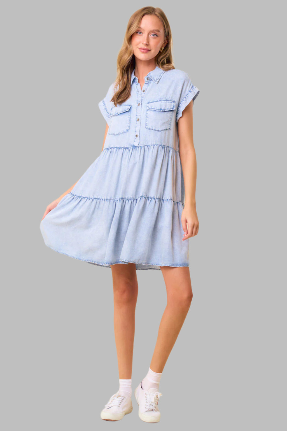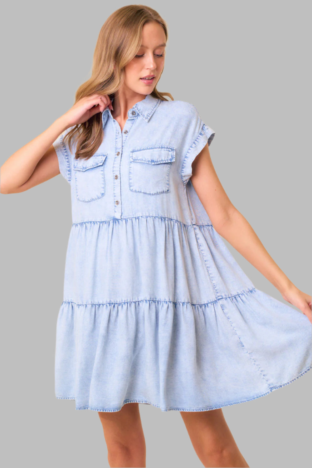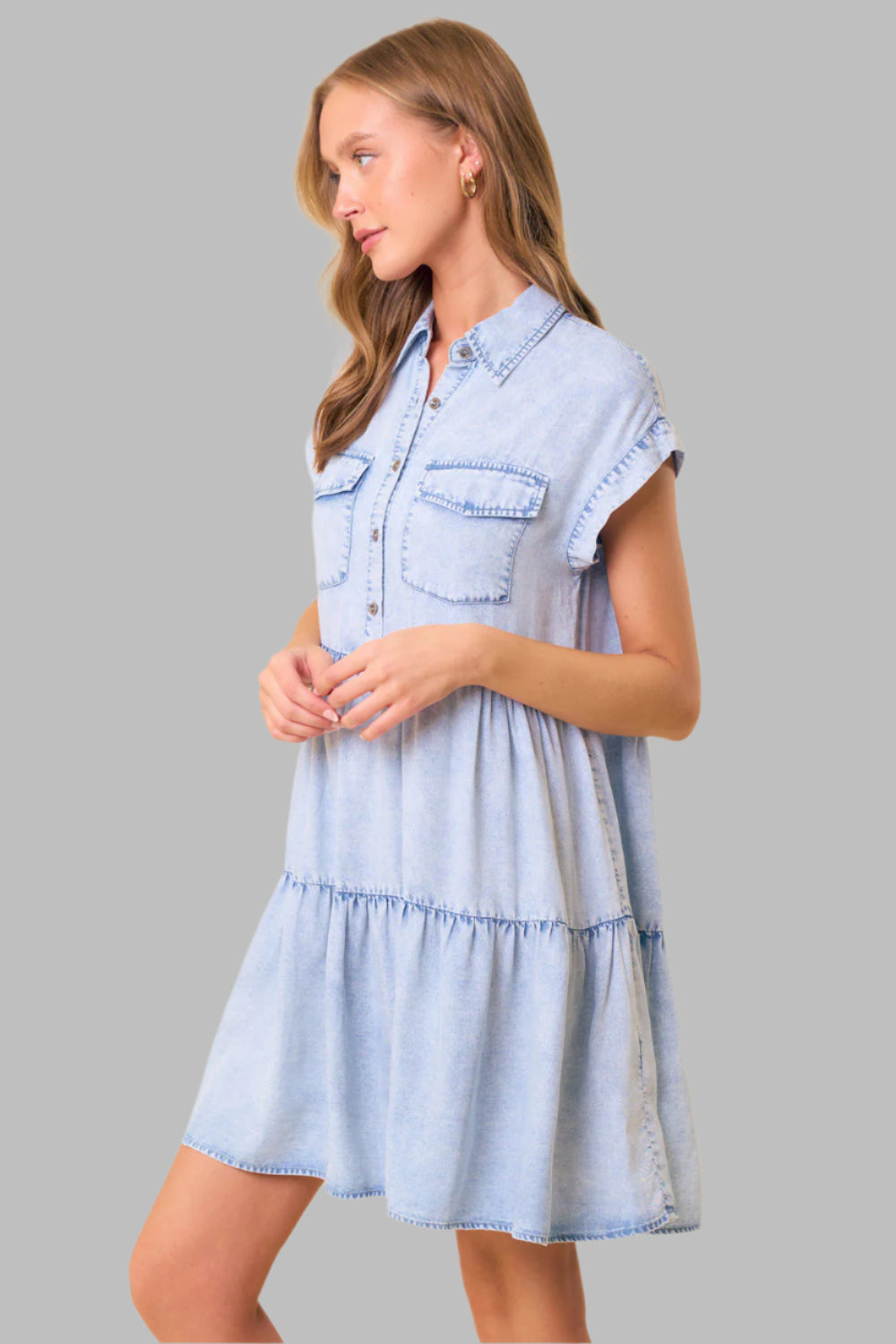Haley Half Button Short Sleeve Tiered Dress Light Denim