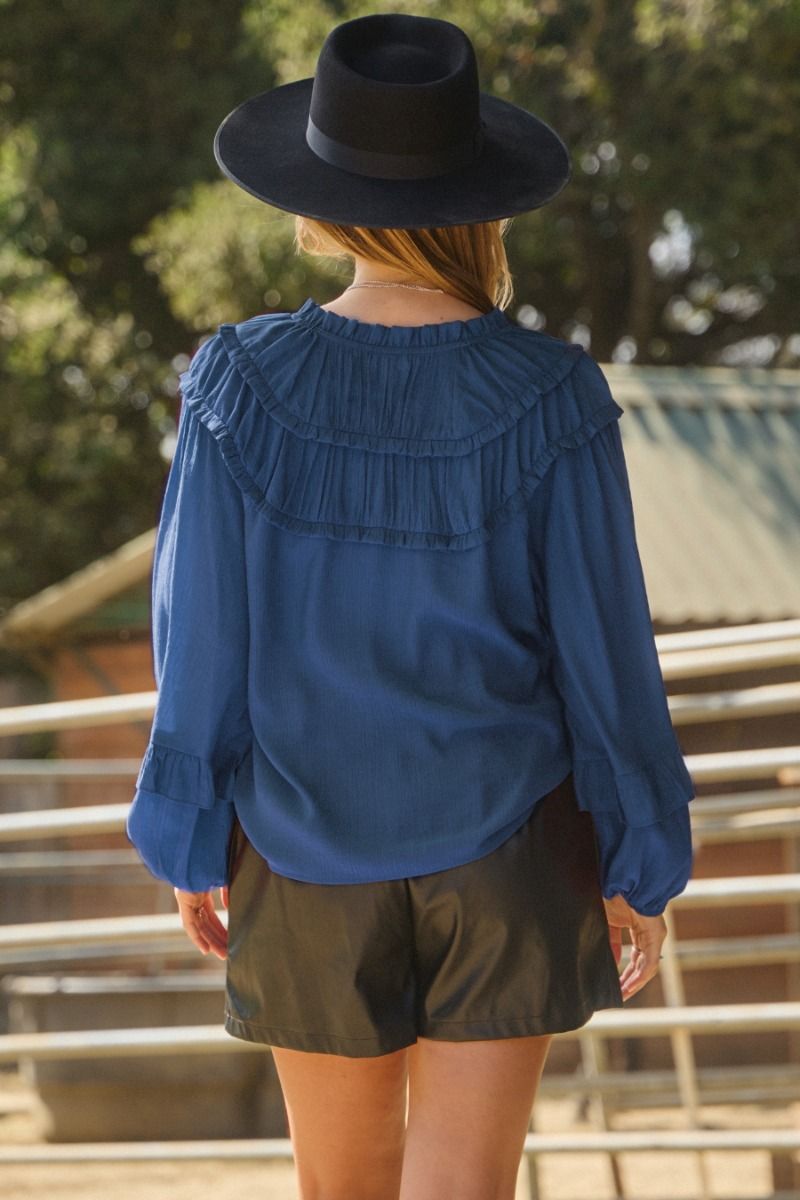 This blouse is gorgeous. Lightweight and easy to wear. Featuring a textured fabric, shirring yoke, notch v neck, tassel trim & long sleeve with ruffle.