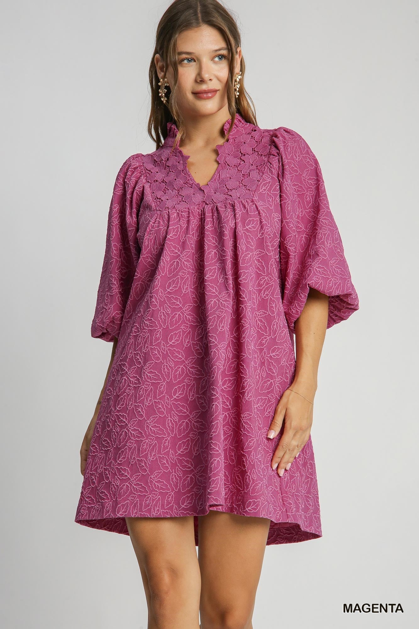 Beautiful lace contrast, A-line dress, featuring a v neck and a jacquard print!! Available in magenta & Navy.