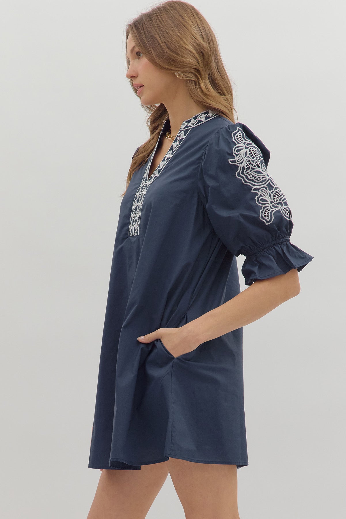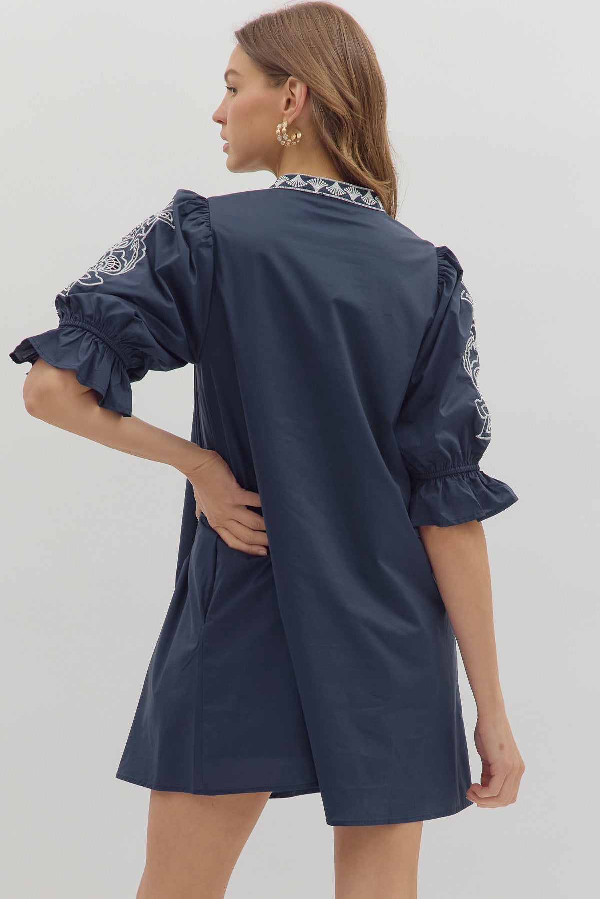 This beautiful solid, ¾ puff sleeve mini dress is definitely a season favorite!! Featuring a floral, embroidered sleeve and accented neck band. Side pockets. Lined. Woven. Non-sheer. Lightweight.