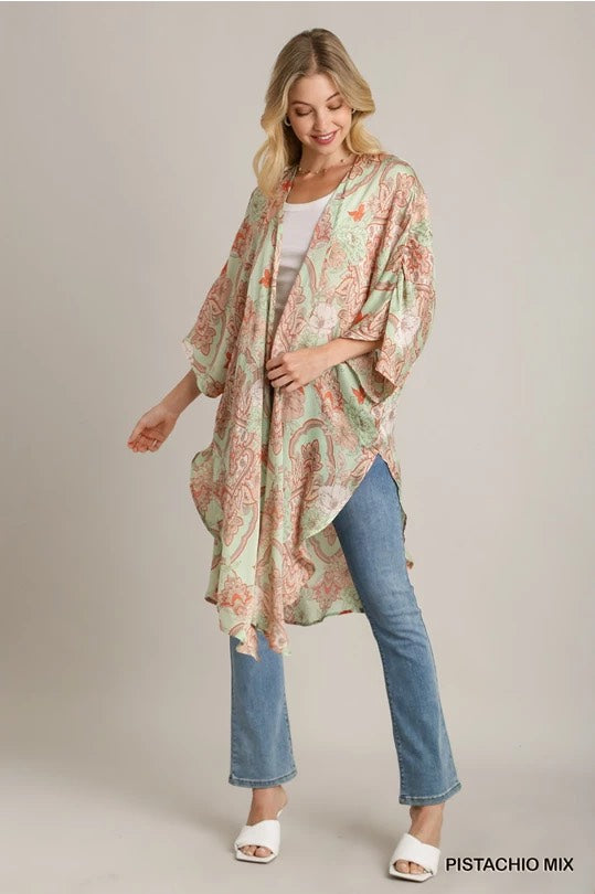 This mixed print open front kimono can be worn as a bathing suit cover up or pair with your favorite tank or camisole. Floral print, star fish cut and beautiful color combinations.