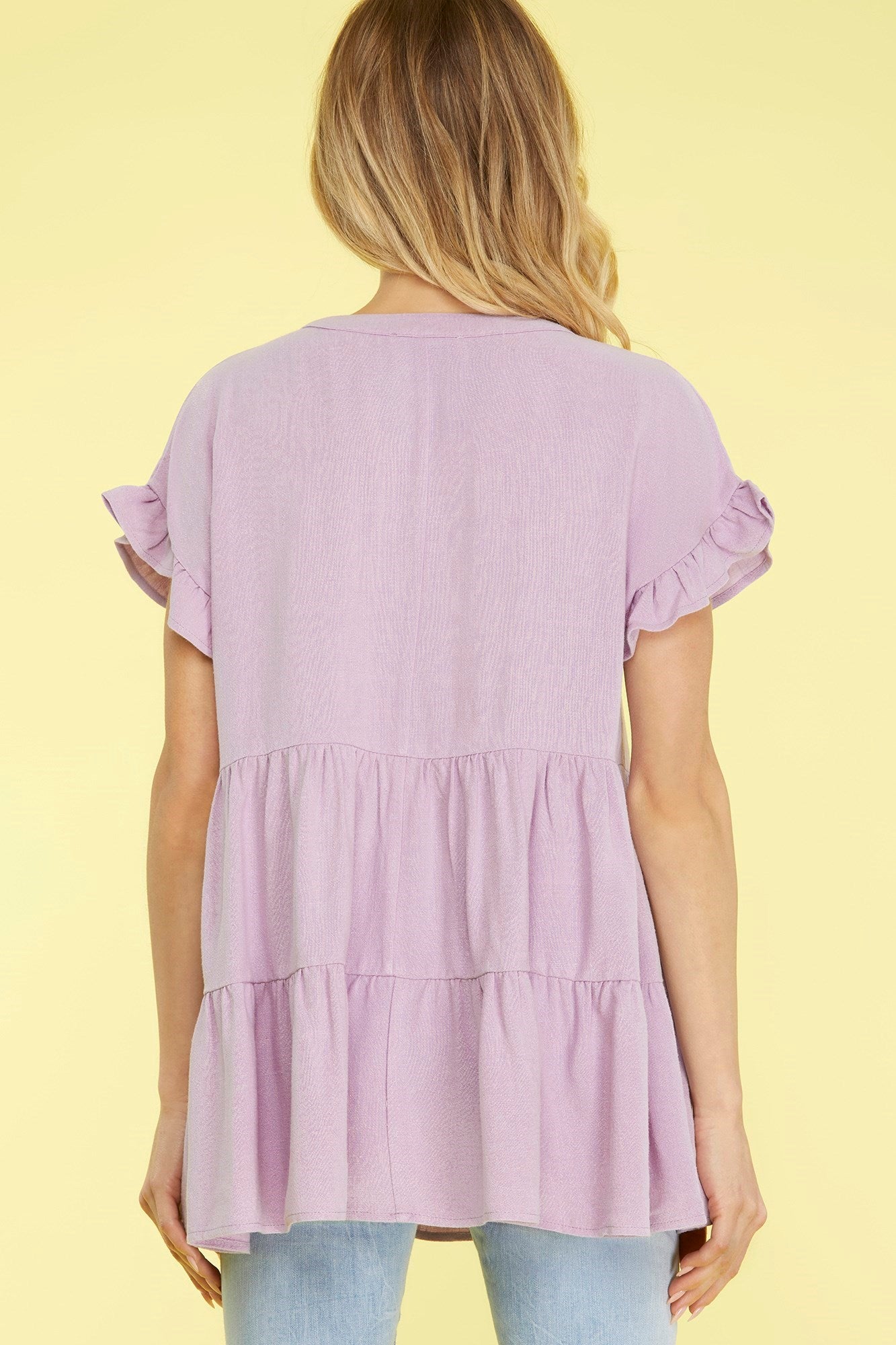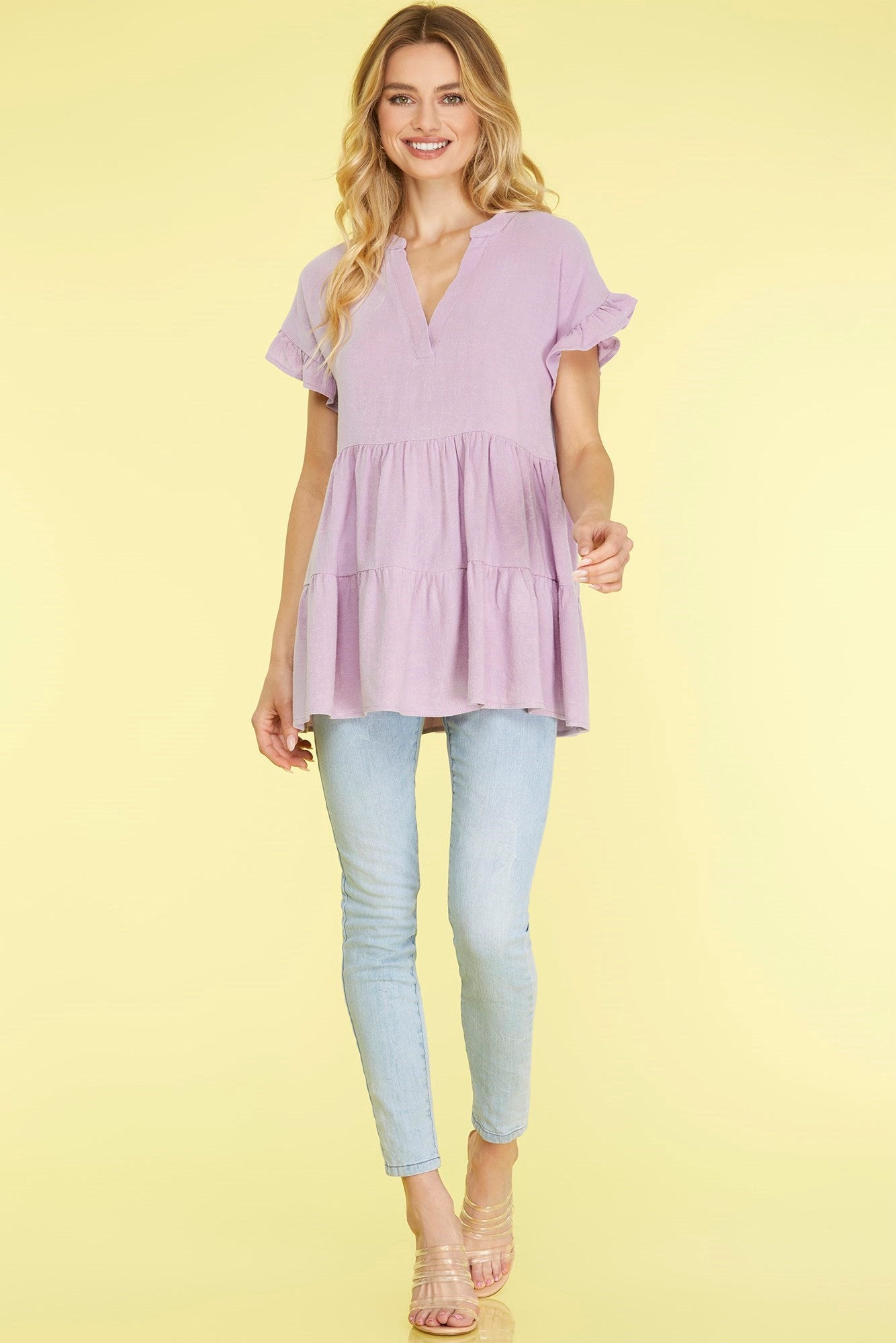 Woven drop shoulder tunic top. Notch neck with tiering.