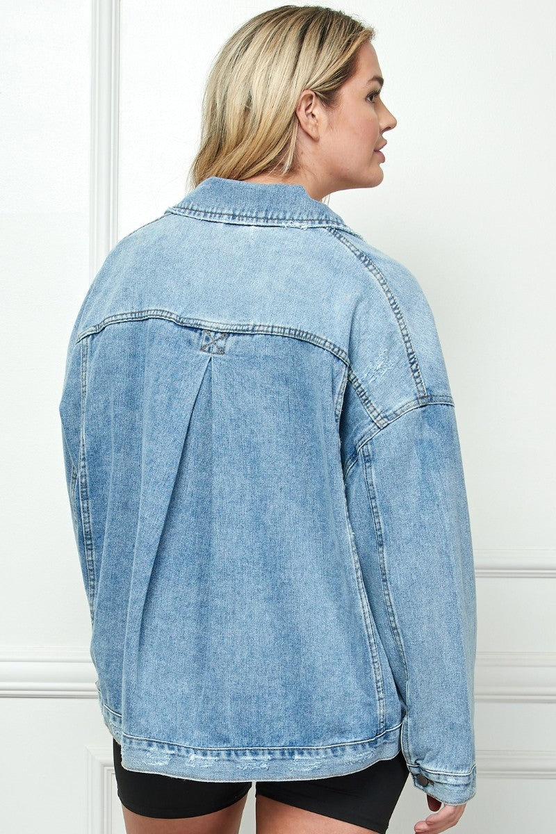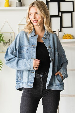 Oversized relaxed fit, spread collar, button front closure, front chest pocket, side pockets, pleated center back and a button cuff. Designed and created by "Veveret".