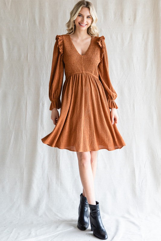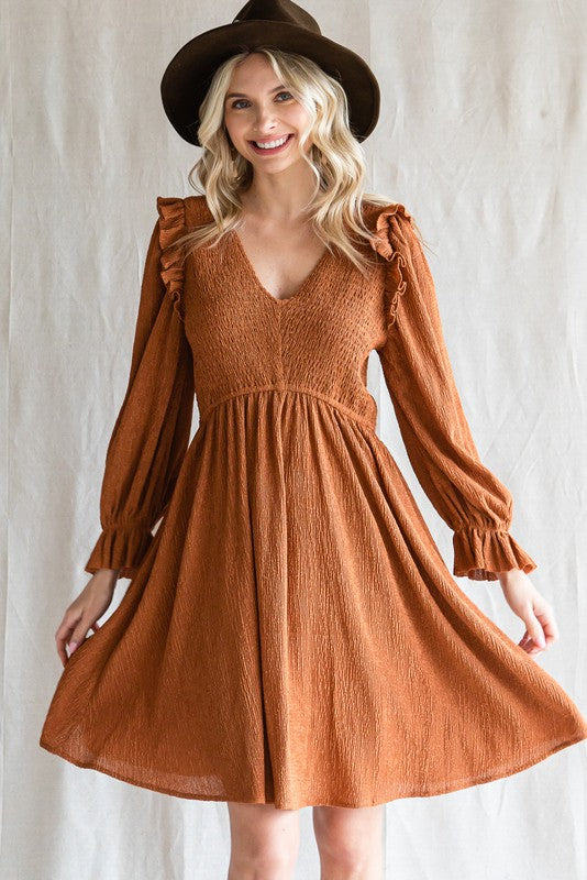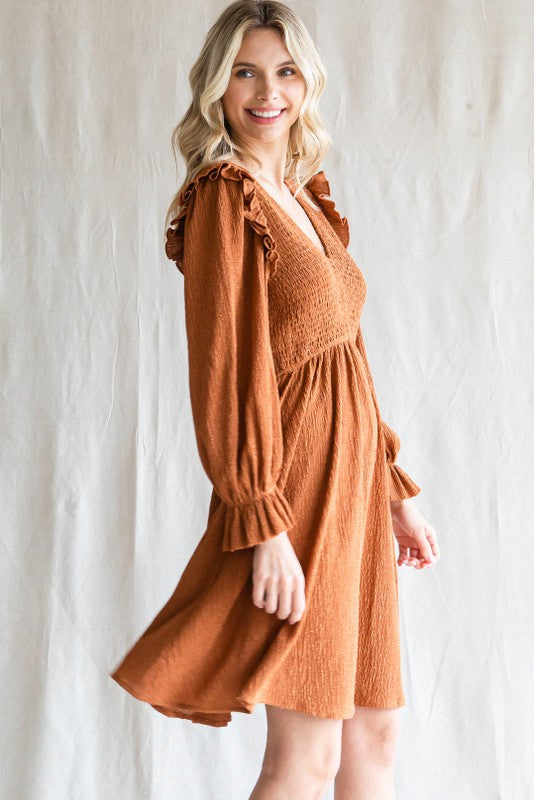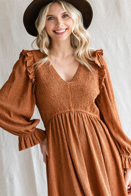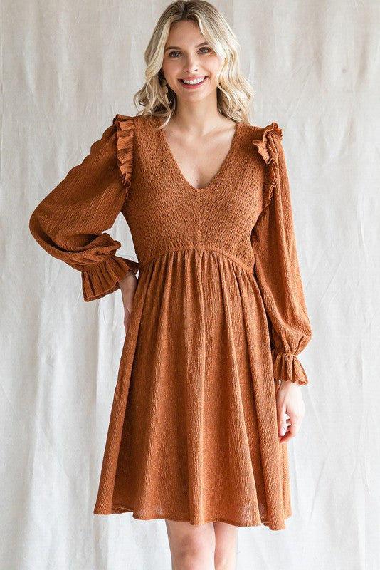 Textured dress with a V-neck, frilled cap shoulder, smocked bodice, long bubbled sleeves, and frilled cuffs. - non-sheer, lightweight.